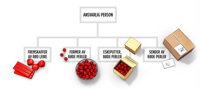 Igjen, en organisasjon må produsere noe. La oss si at produktene dens er gjennomhullede perler, perler trædd på snor og perler som er lagt i esker. Vi ville få dette: