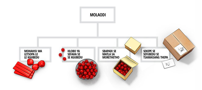 Hape, mokgatlo o lokela ho hlahisa hohong. A re re dihlahiswa tsa mokgatlo di phuntswe, di metswe ka dikgwele ebile di otlwa ka mabokoseng. Re tla fumana sena: